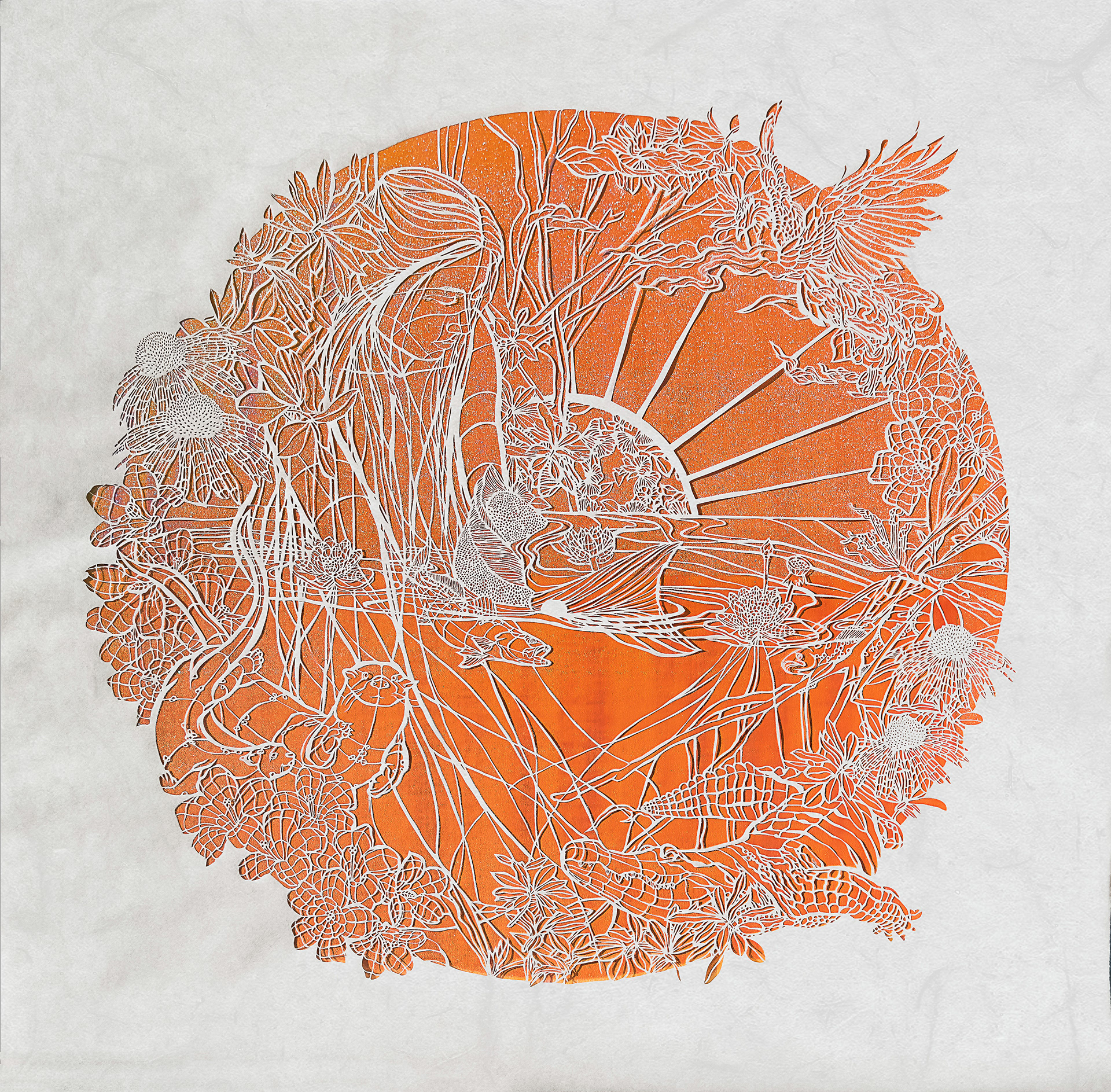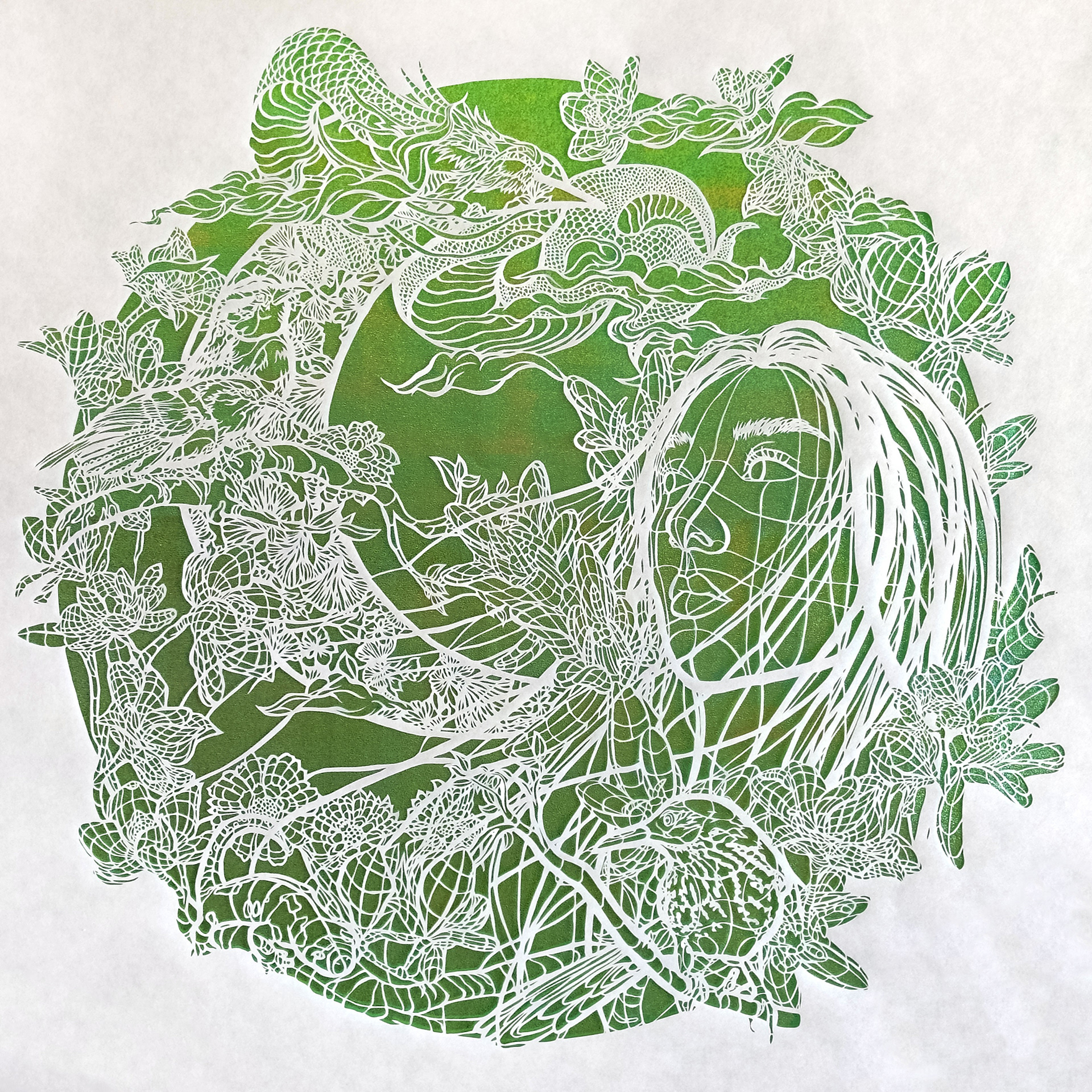 MeSun and the Imoogi’s Sky, hand cut Kozo on iridescent paper, 40 x 40 inches, 2025