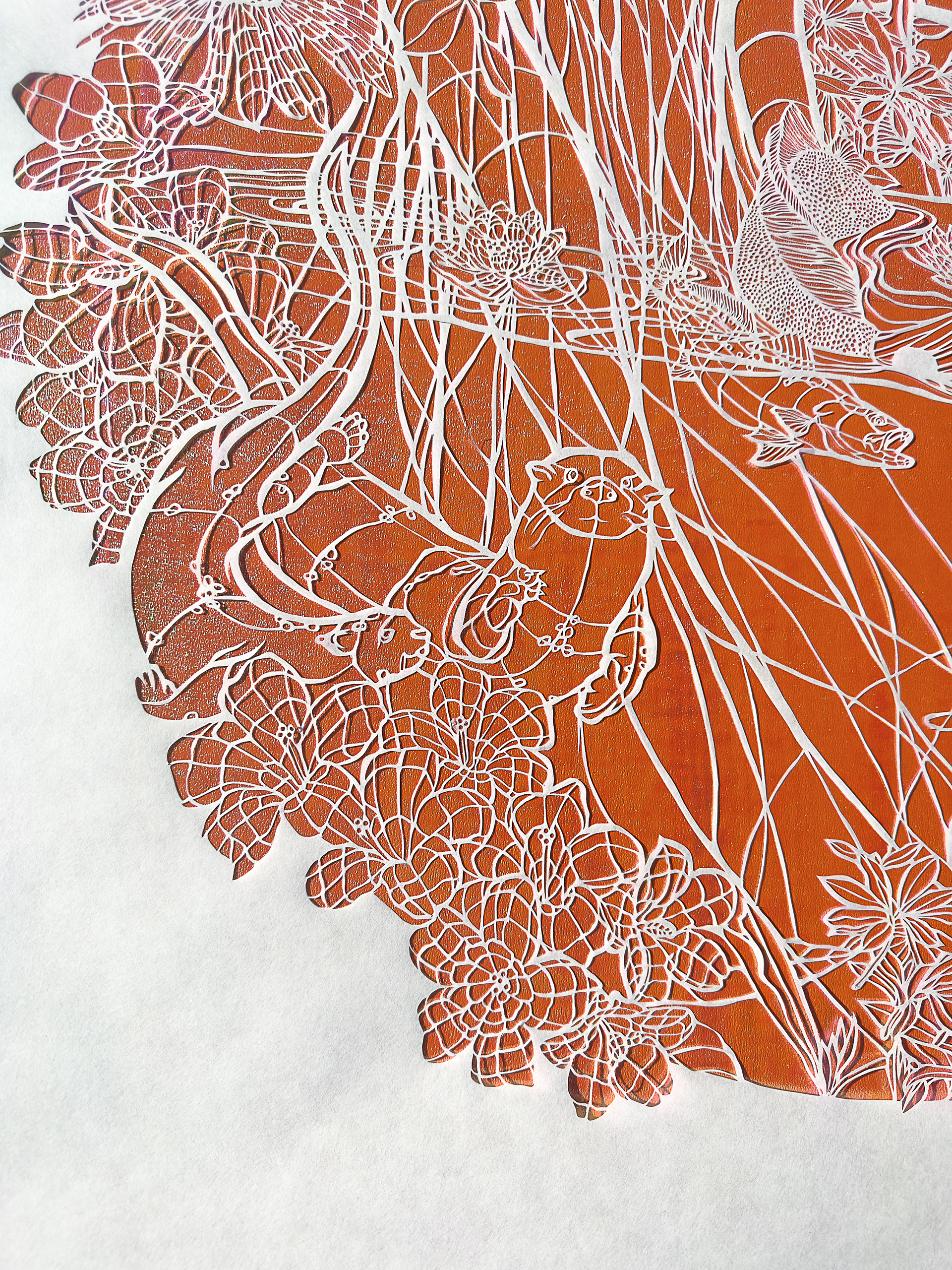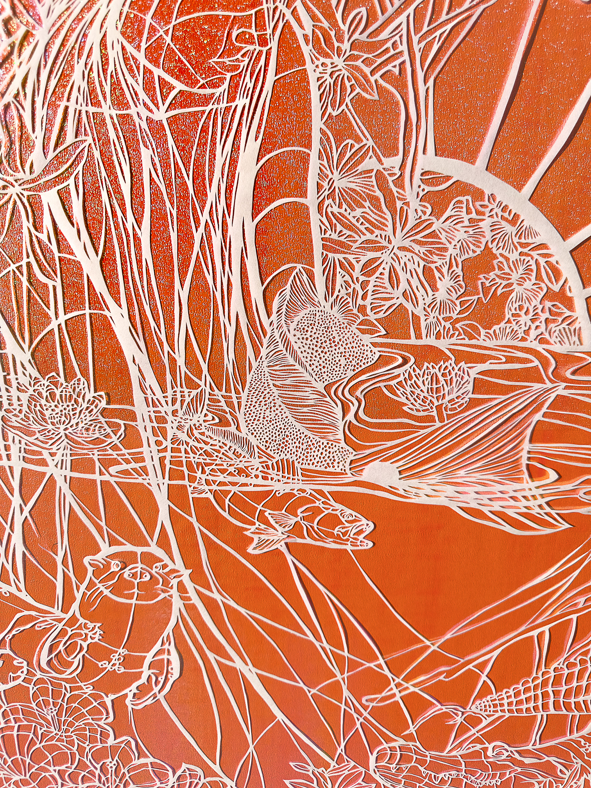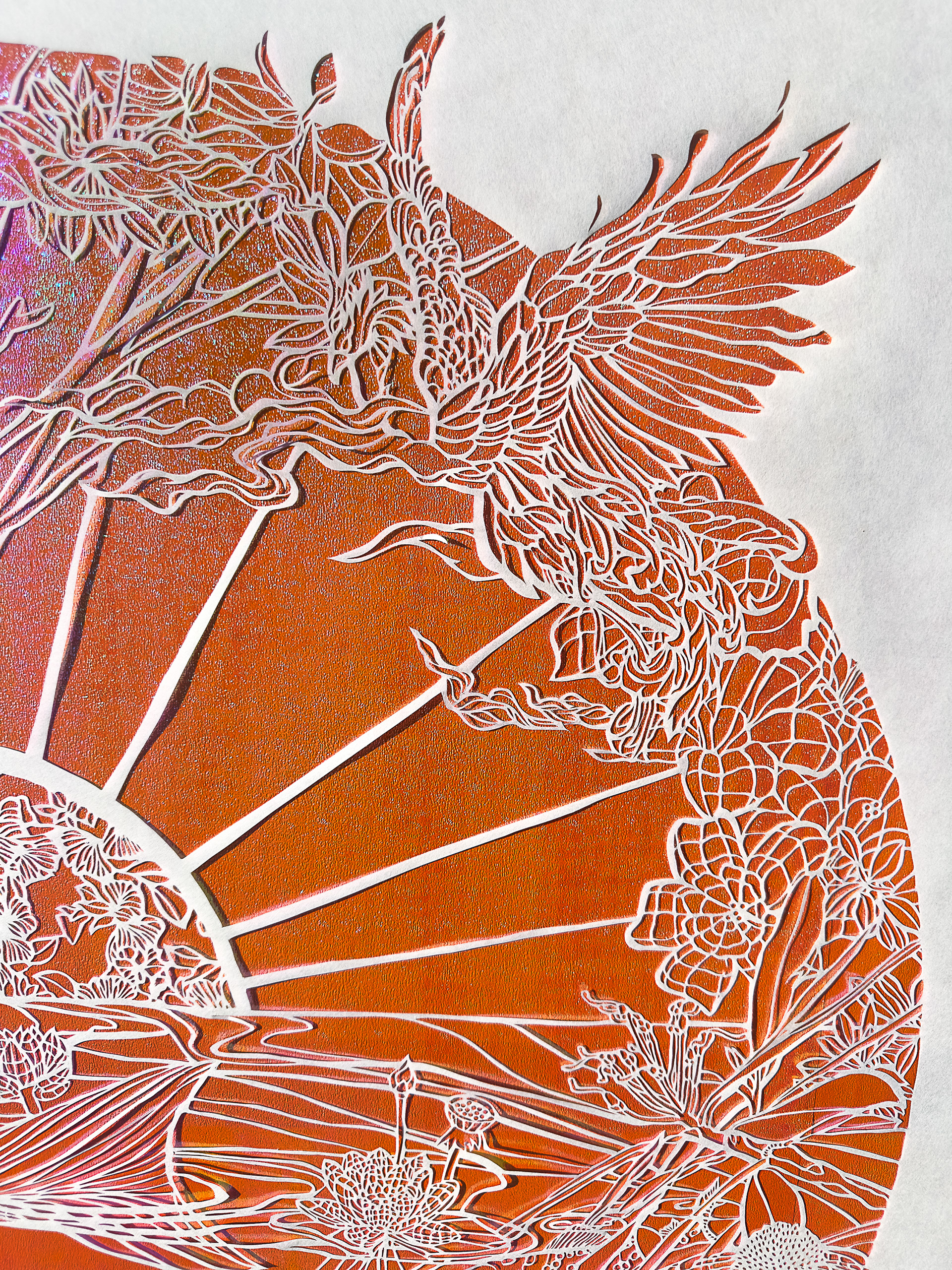 MeSun and the Imoogi’s Sky (Detail) , hand cut Kozo on iridescent paper, 40 x 40 inches, 2025