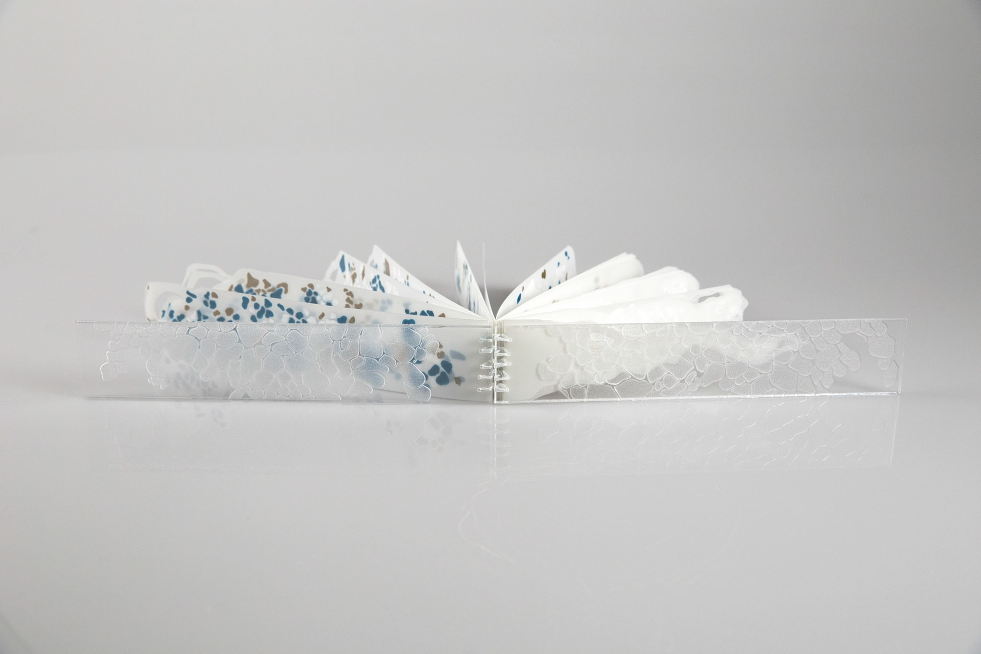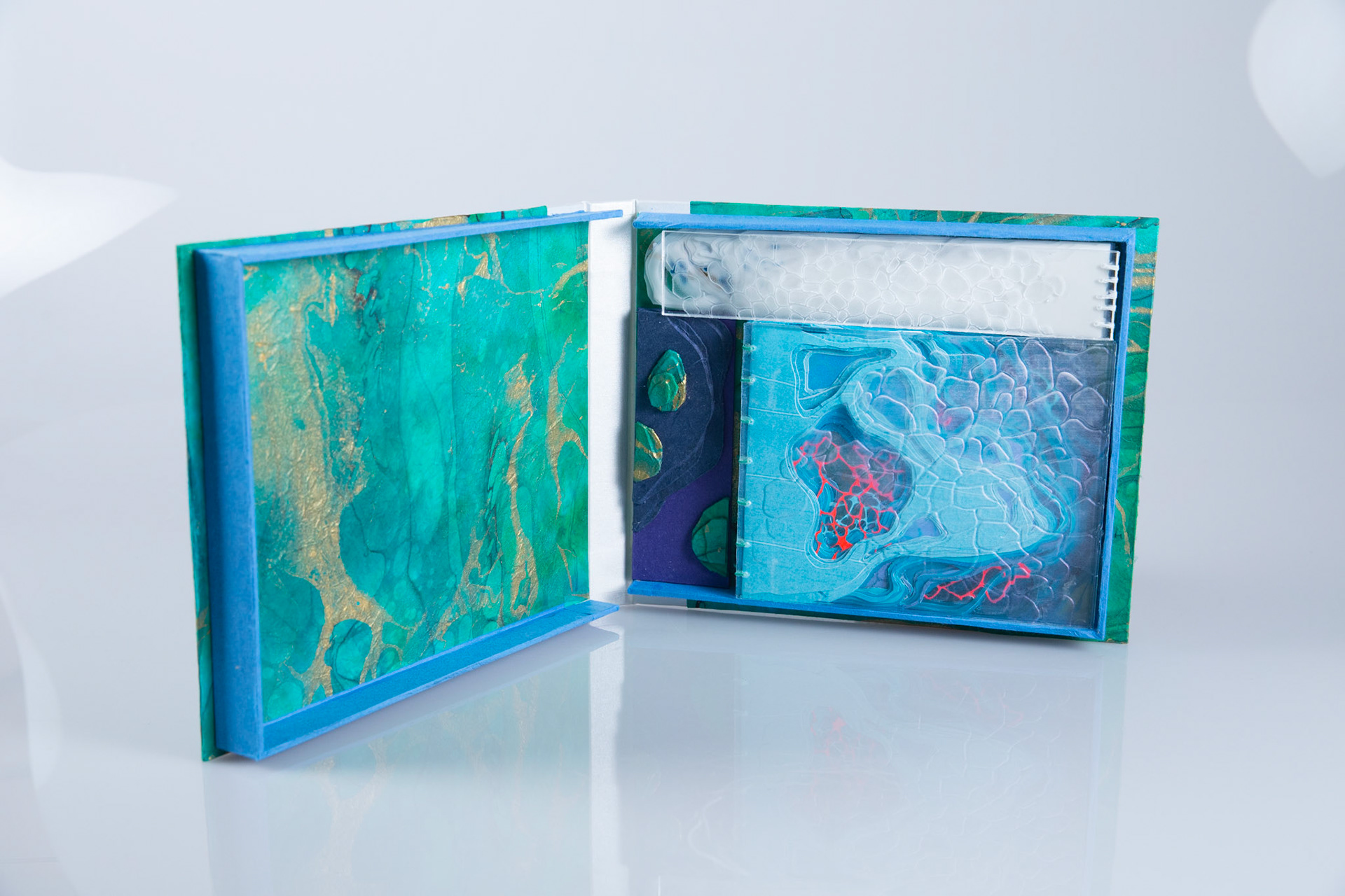 Wonders Down Unda Back View Opened, paper, embroidery floss, binders board, 4” x 4 7/8” x 1 9/32” (closed), 2022